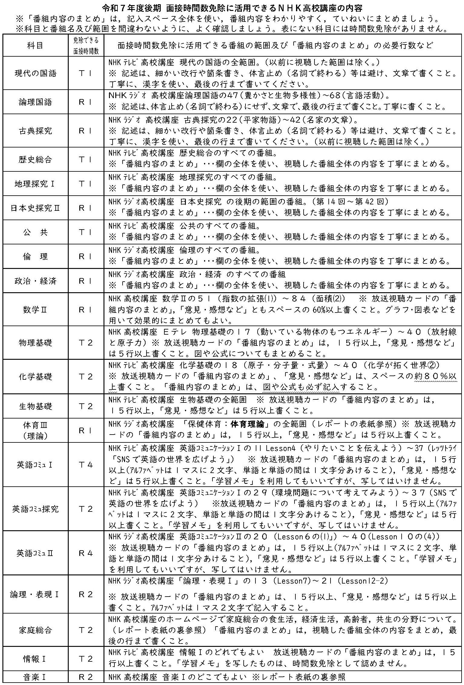 ラジオ面接免除時間数 前期 後期 国語 言語文化 ラジオ 1 なし 現代の国語 Eテレ なし 1 論理国語 ラジオ 1 1 古典探究 ラジオ 1 1 地理歴史 地理総合 Eテレ 1 なし 地理探究Ⅰ Eテレ なし 1 歴史総合 Eテレ なし 1 日本史探究Ⅱ ラジオ なし 1 世界史探究Ⅰ Eテレ 1 なし 公民 公共 Eテレ 1 1 倫理 ラジオ 1 1 政治・経済 ラジオ 1 1 数学 数学Ⅰ Eテレ 1 なし 数学Ⅱ ラジオ 1 1 数学A Eテレ 1 なし 理科 物理基礎 Eテレ 2 2 化学基礎 Eテレ 2 2 生物基礎 Eテレ 2 2 保健体育 体育Ⅲ(理論) ラジオ 1 1 芸術 音楽Ⅰ ラジオ 2 2 外国語 英語コミュニケーションⅠ Eテレ 2 4 英語コミュニケーションⅡ ラジオ 4 4 論理・表現Ⅰ Eテレ 4 2 英語コミュニケーション探究 Eテレ 4 2 家庭科 家庭総合 Eテレ 2 2 情報 情報Ⅰ Eテレ なし 2 ※ 以下の表にない科目には面接時間数の免除がありません。