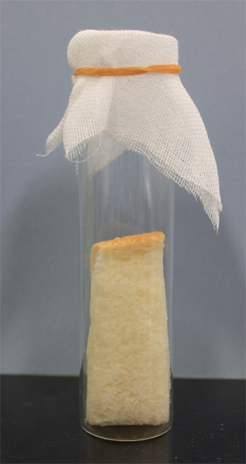 - 減菌した管ビンにパン1片を入れ,水5mℓ程度,防腐剤数滴と酵母液3mℓ程度を加える。