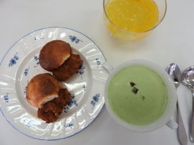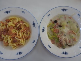 | パスタとクリームシチュー | クリームコロッケパンとグリーンクリームスープ | |