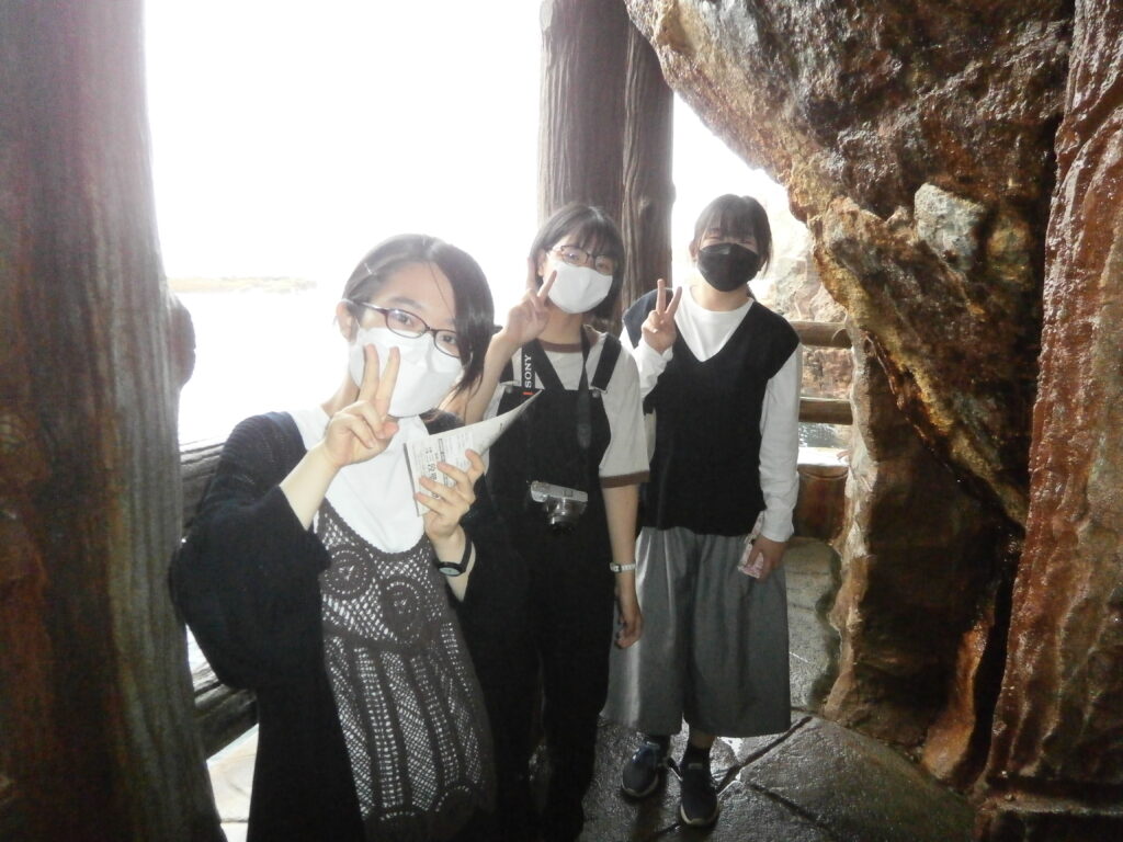〇三段壁洞窟:洞窟内に打ち寄せる激しい波の音と迫力に圧倒されました。岸壁近くまで生徒達は散策にでかけました。