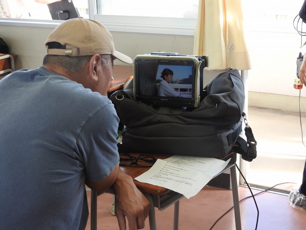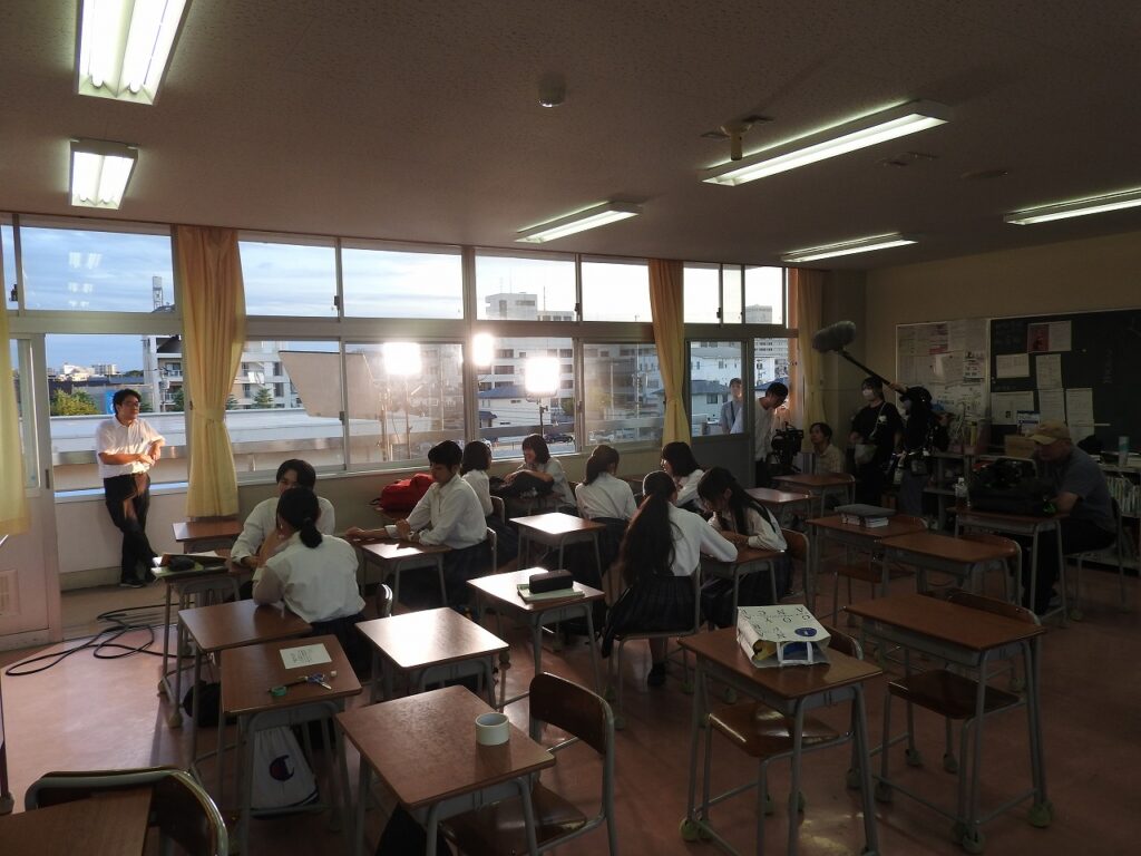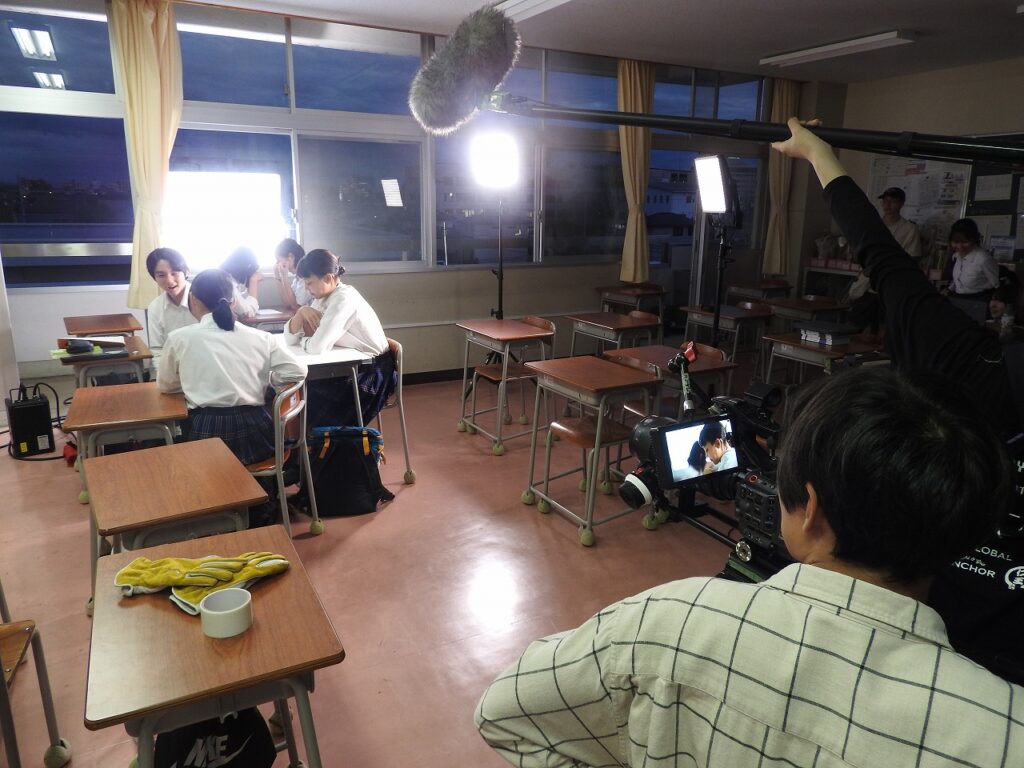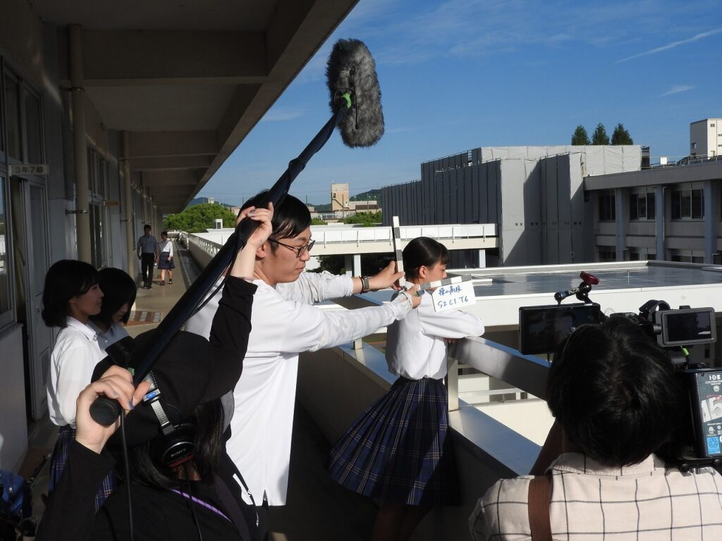 照明を当てて、カチンコでスタートするビデオ撮影。まるで映画撮影のような風景が、岡山操山高校で見られました。
