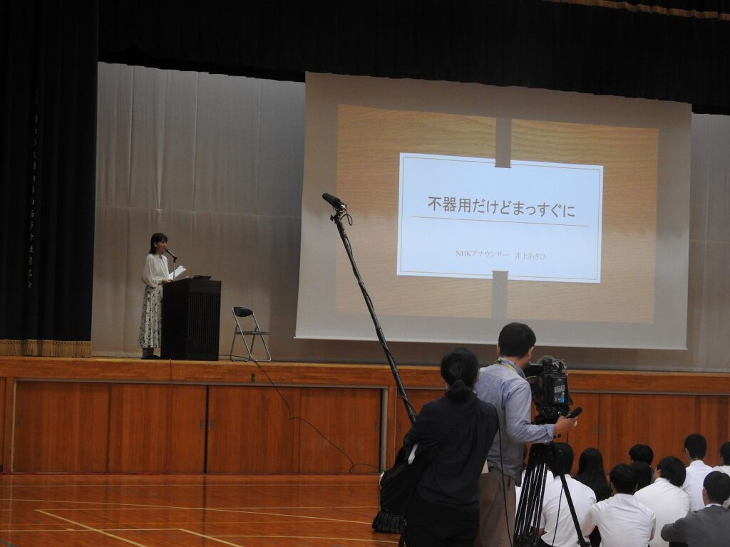 10月21日(火)、NHK岡山放送局の井上あさひアナウンサーが来校され、2年生を対象に講演をしていただきました。NHK学園出前講座として企画されたものです。アナウンサーに講演していただき、アナウンサーという職業を通じて学んだこと、経験したことを聞いて、これからの意識向上に役立てるという講座です。