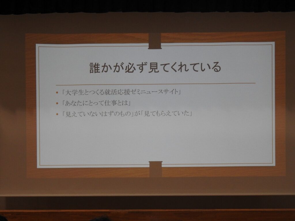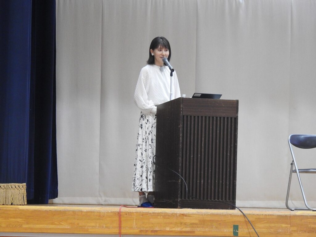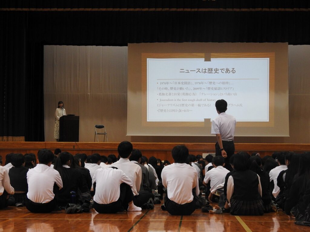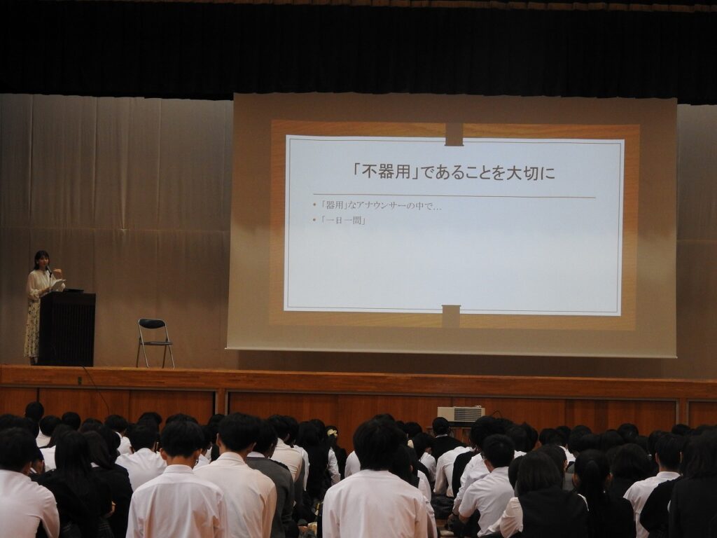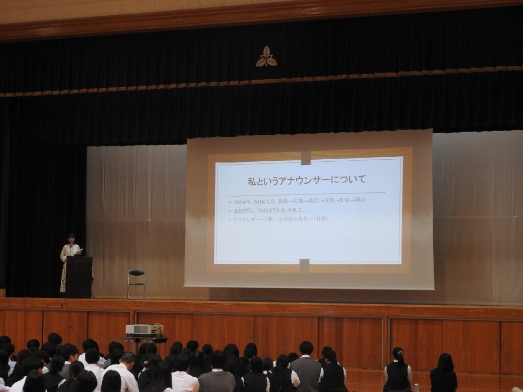 鳥取局から始まったアナウンス人生のこれまでの歩み、自分を取り巻く先輩アナウンサーや自身が出演した番組などを取り上げられ、文字通り「まっすぐ」に生徒にお話を伝えていただきました。