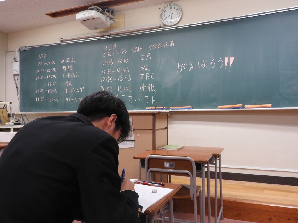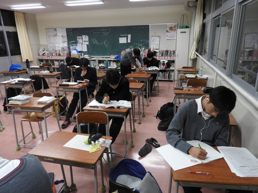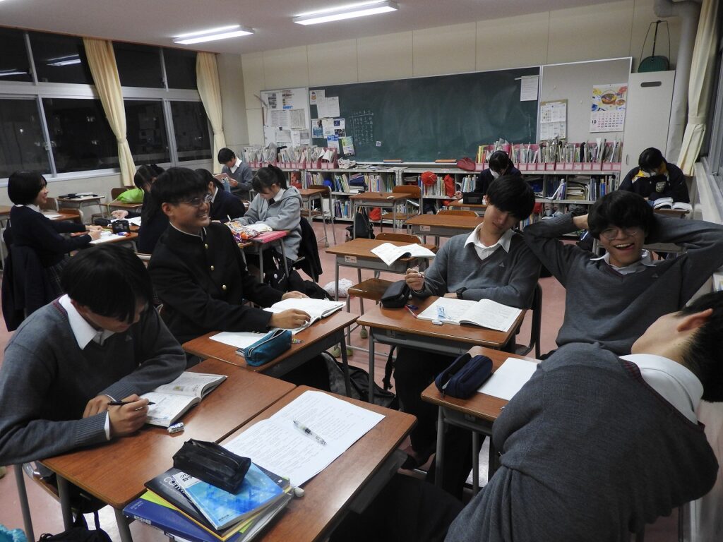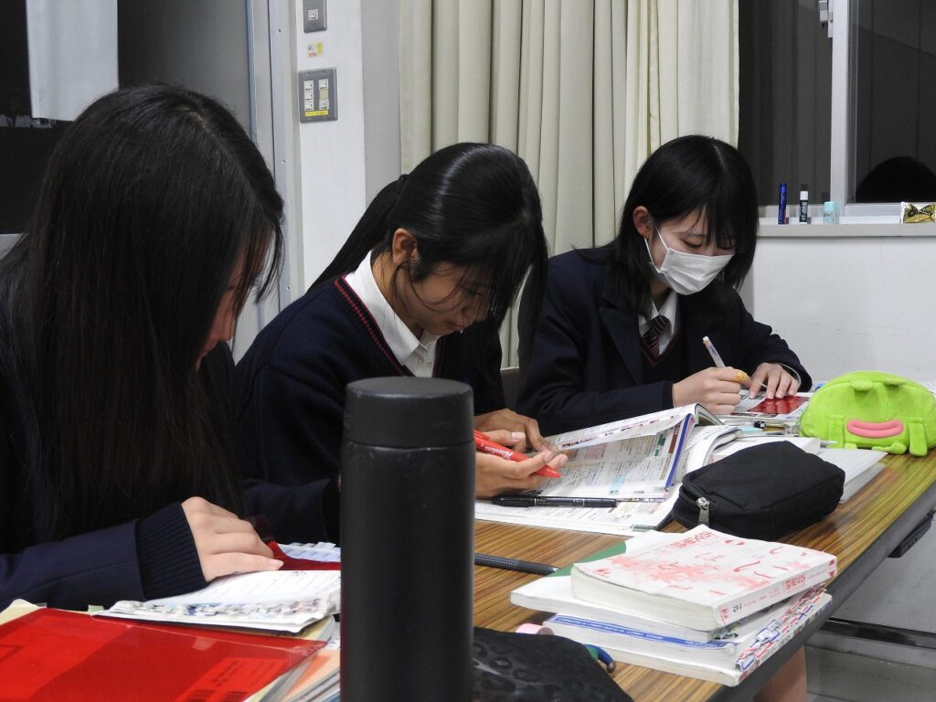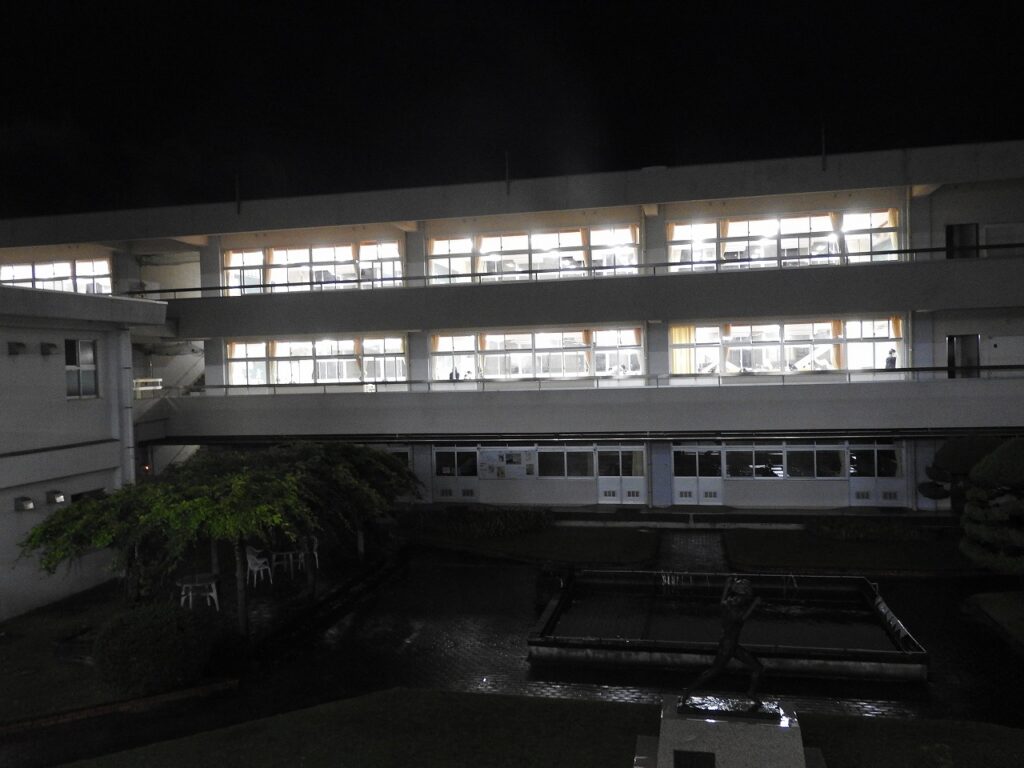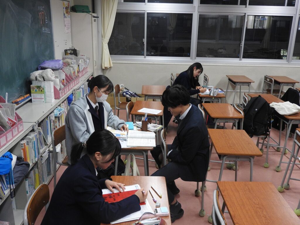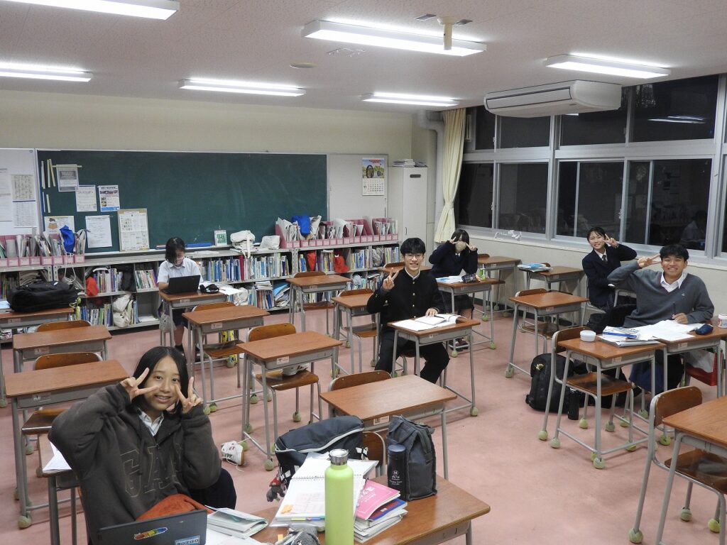 闇夜に煌々と輝く蛍光灯の下で、操山生が勉強に励んでいます。放課後の教室で、頑張っている3年生です。土日は模試ざんまい。また推薦・総合型選抜入試も始まっています。仲間とともに、先生とともに、静かにスパートを掛けています。