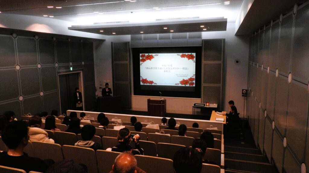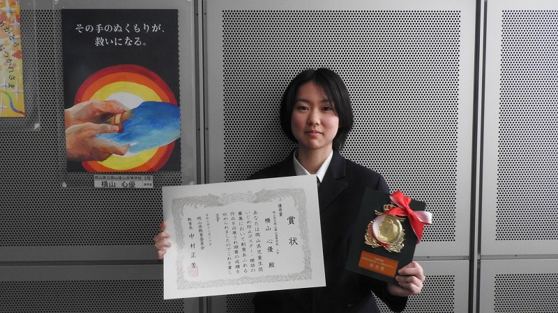 「岡山県児童生徒いじめ防止ポスター・標語」に応募していた、3年横山心優さんのポスターです。ポスター部門に応募があった6,844点の中から、最優秀に次ぐ優秀賞を受賞しました。その表彰式が、12月20日(土)、岡山県立図書館でありました。