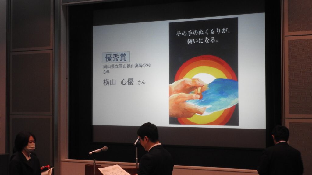 ポスター・標語それぞれの最優秀・優秀賞受賞者が、岡山県教育委員会中村教育長から表彰を受けました。横山さんも、他の受賞者と共に賞状と盾を授与されました。このポスターは、岡山県立図書館1階エントランス西口通路に、1月12日(月)まで展示されます。