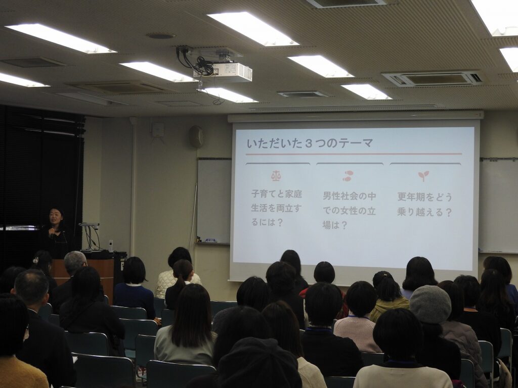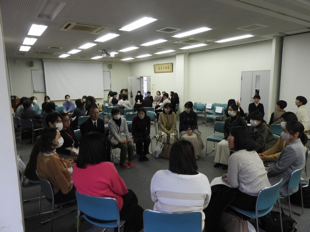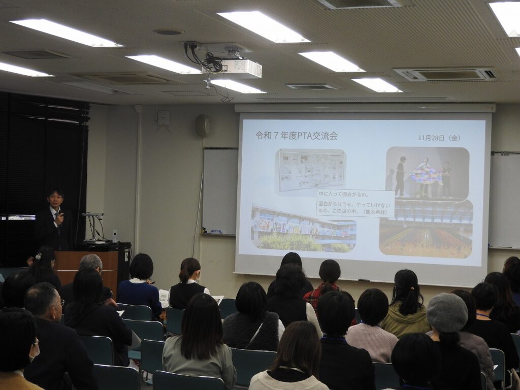 11月28日(金)午後、PTA研修企画委員会主催で、「校長・中学副校長の講話、先生との交流会」が開催されました。前半は、校長と中学副校長から硬軟織り交ぜたお話があり、後半は各学年の輪に教員が入っての交流会でした。