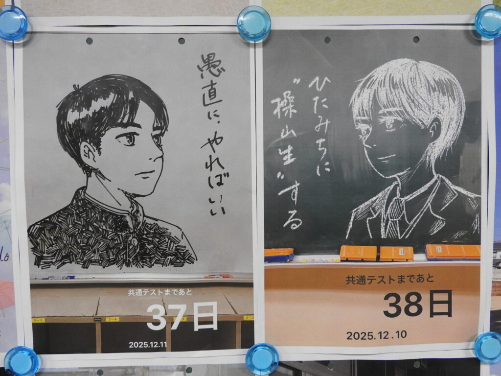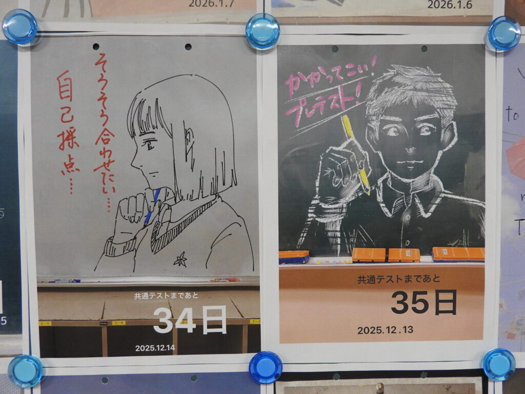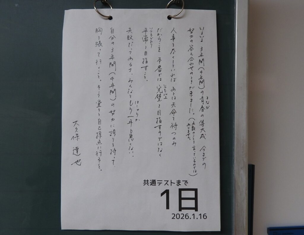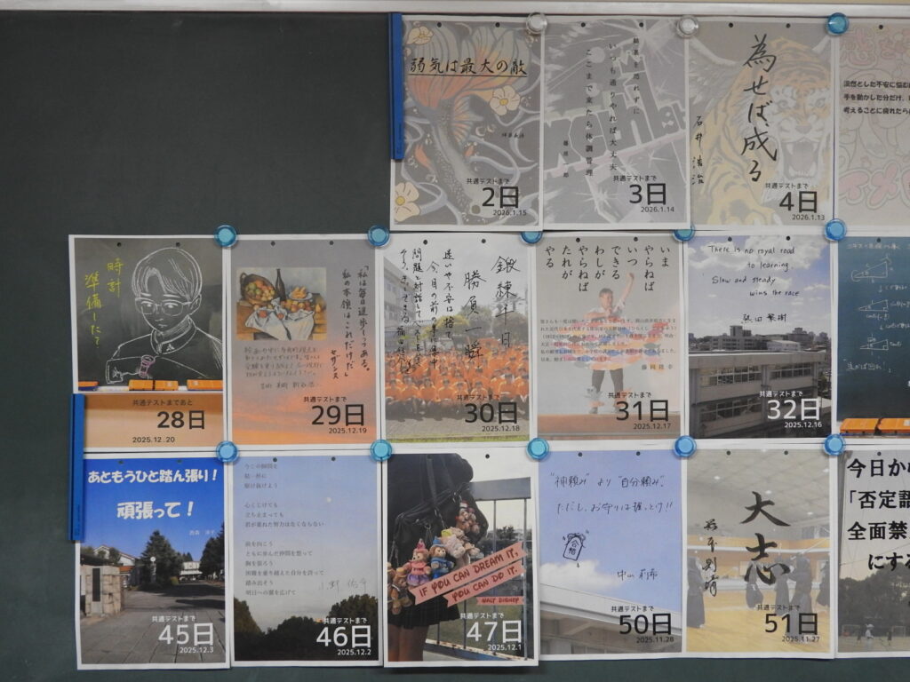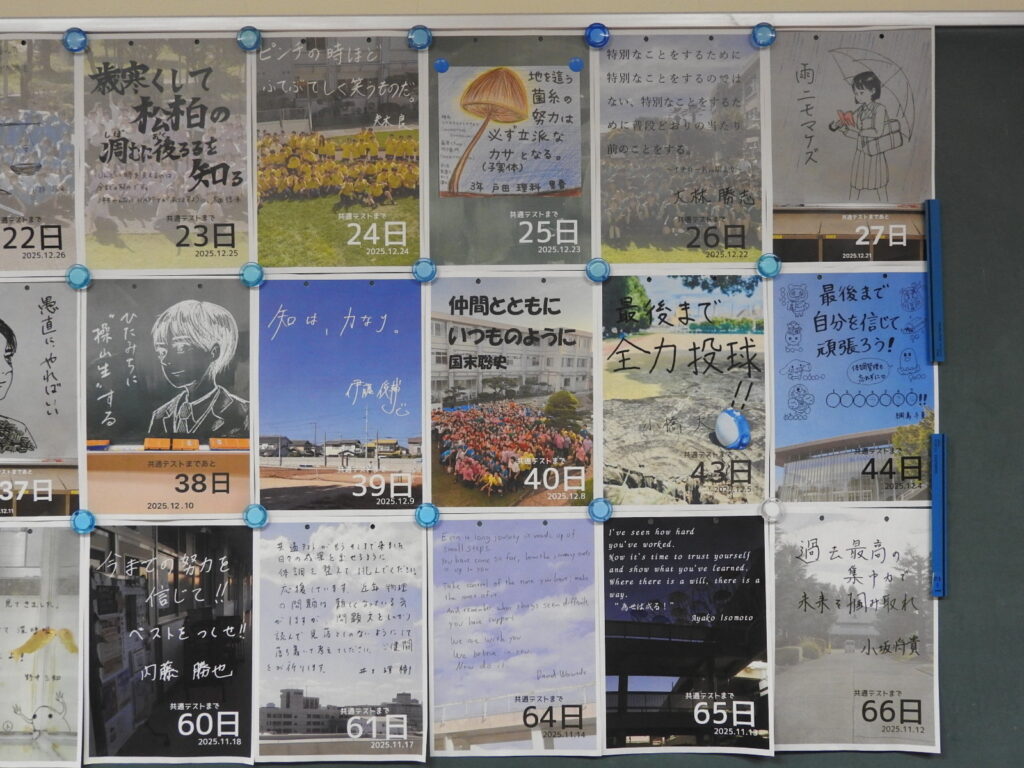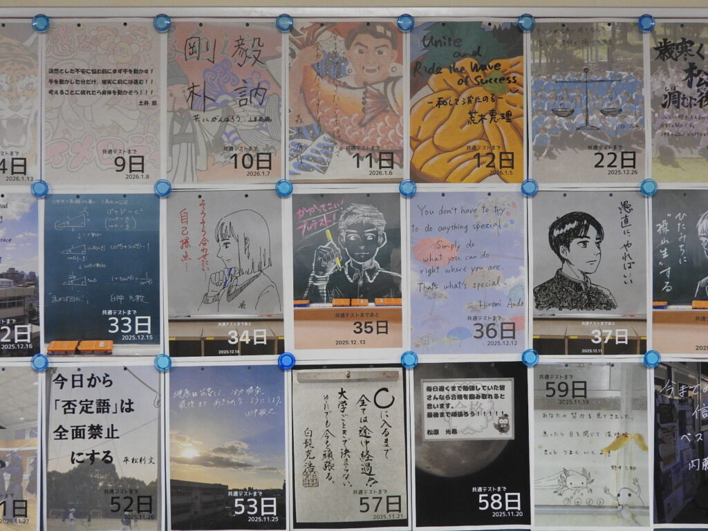 それは66日前の11月12日にスタートしました。共通テストまでの、日めくり応援メッセージカレンダーです。3年の教室に掲示され、毎日1枚ずつめくられてきました。