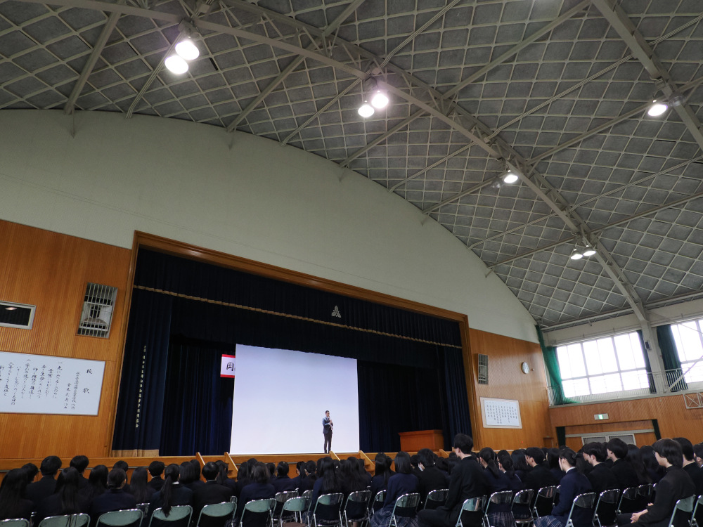 引き続き、生徒会主催による「3年生を送る会」が行われました。日頃とはひと味違う部活動の後輩や先生方の姿、お祝いのメッセージが映像で紹介され、会場は温かい雰囲気に包まれました。生徒会執行部が撮影・編集したメッセージビデオが上映されると、3年生は懐かしそうに映像を見つめていました。