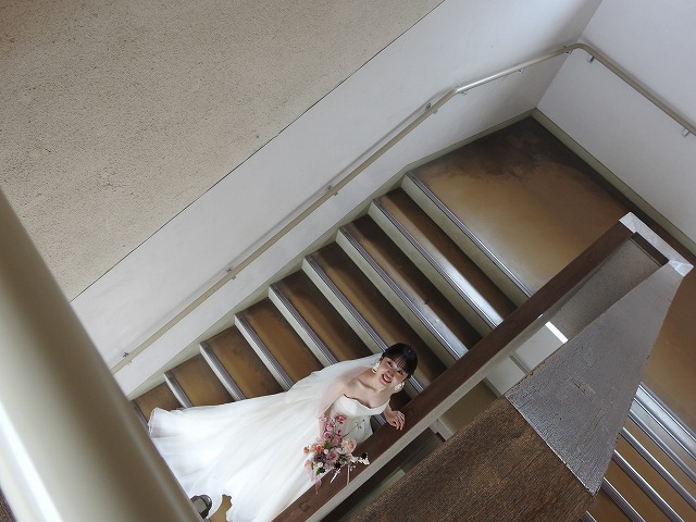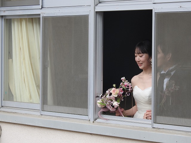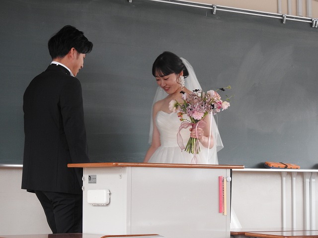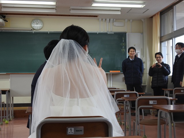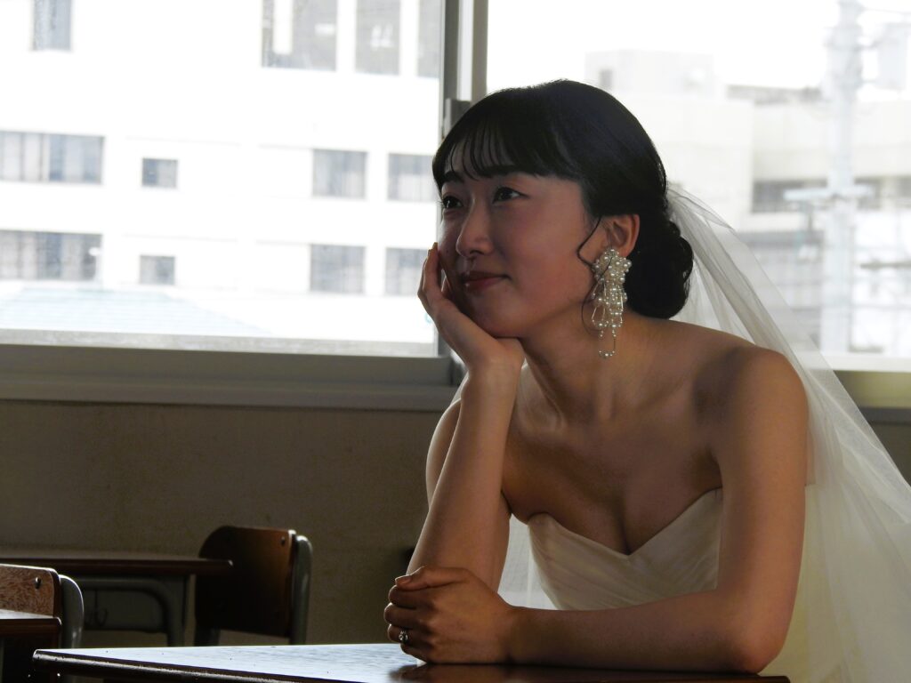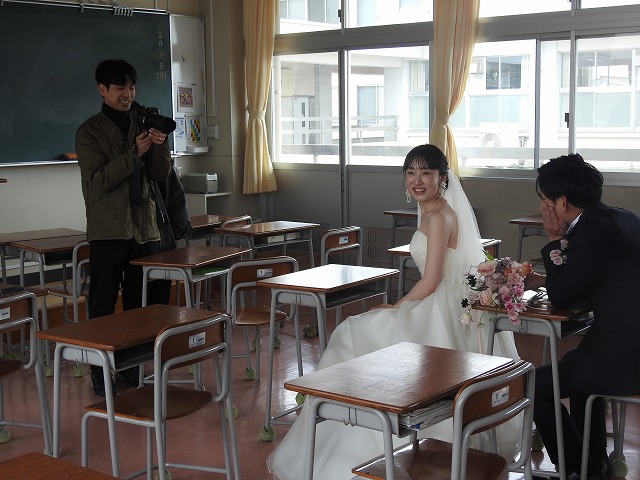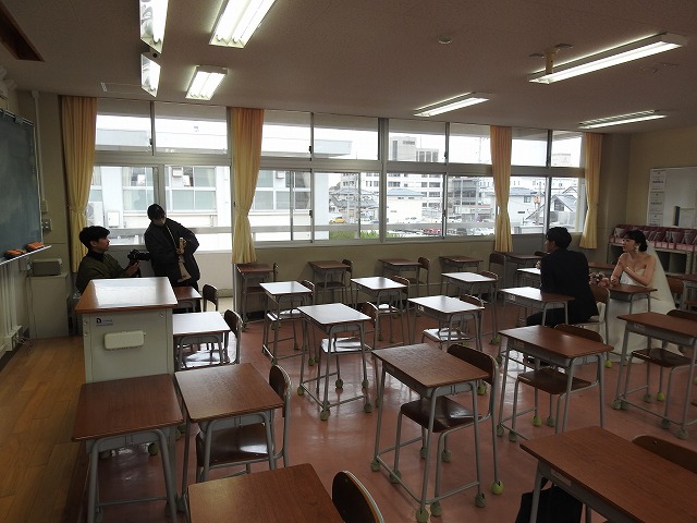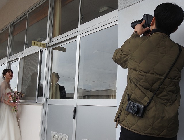 2月のとある週末、人の気配のない校舎に、ウエディング衣装の女性、そして正装した男性の姿がありました。二人の祝宴に添えられる写真の撮影場所に、この岡山操山高校が使われました。