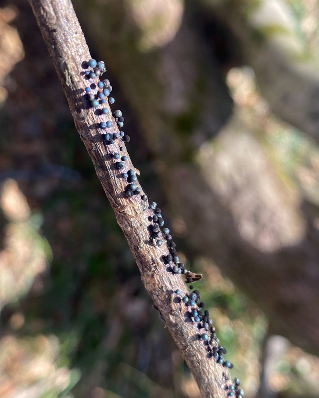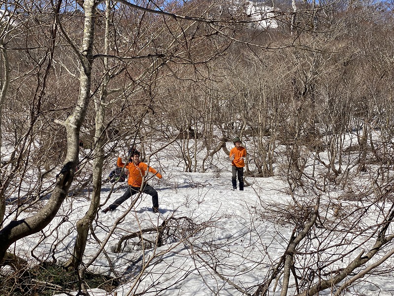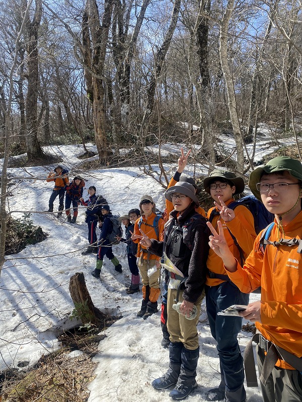 日曜日の早朝に起床し、川床登山口から登山行動開始です。顧問を先頭に、読図をしながら大休峠まで進んでいきます。まだ道中には雪が残り、目新しい景色に部員たちは心踊らせていました。昼前に目的地である大休峠に到着し、しばし休憩。ご飯を食べたり、雪合戦をしたり。そしてなんと、前日に見せてもらった変形菌(ルリホコリ)を発見!好雪性のルリホコリは、出没地や時期が限られていて貴重だそうです。今まで気に留めていなかった変形菌ですが、山にはまだまだ知らない世界が広がっていました。山の植生について学ぶことも、山岳部の活動の一つです。再来週の大会に向けて、引き続き準備をがんばっていきます。