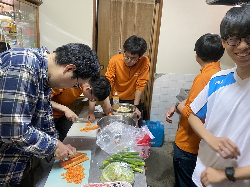 例年、この時期の大山は気温が低く、前乗りしてゲストハウスや旅館に宿泊し、雨風をしのぎます。今年はゲストハウス寿庵さんにお世話になりました。部員たちは夕食に焼きそばを自炊し、みんなで楽しく食べました。