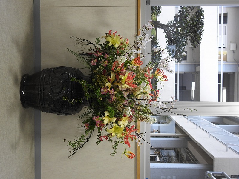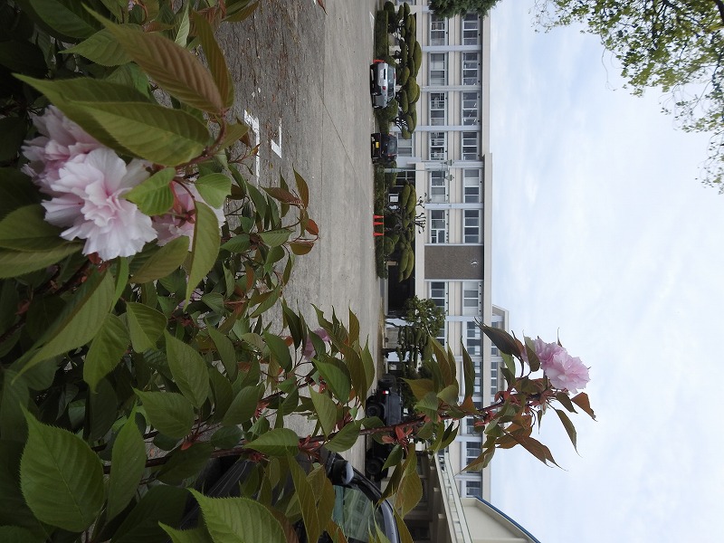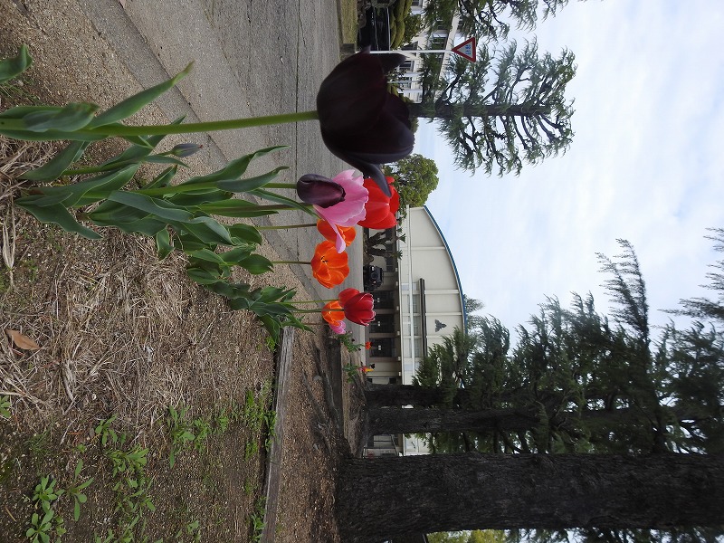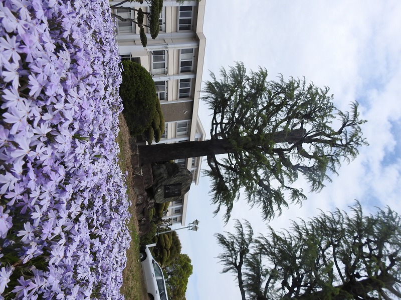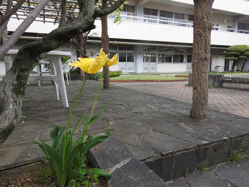 春の暖かさに誘われて、校内の花々が競演を始めています。校門を入って時計台のある左手を見ると、まずは青、緑、赤の可憐なお花と青葉がお出迎えです。言葉は発しないものの、見て見て!と言っているようです。さらに進むと芝桜の一群が、今年も石碑のそばで勢いをつけています。ちょっとエリアが広がっているかな?おやっ?右手を見るとチューリップが色とりどりの花を咲かせています。昨年3年生が掃除の時間に植え、水やりの世話をしていたものです。球根が立派に根付いて、花を咲かせていますよ。さらに進むと、南門横にボタン桜が咲いています。昔はここが正門だったんですよね。中庭に進むとステージ横にもチューリップが咲いています。これも昔生徒が植えたものが、幾冬を越え、今も残って花を咲かせています。さらにもう一つの中庭に進むと、大きな桜の木々が大輪の花を付けています。よーく見ると卒業生寄贈という文字が見えます。今年もきれいに咲きました。卒業生の皆様、ありがとうございます。反対側を見ると、ここにもいっぱい咲いていますね。たんぽぽ。生命力が強く、日陰でもしっかりと咲いています。さて、では帰りましょうか・・・あっ、そうそう、玄関にも咲いていました。入学式式場で壇上にあったお花です。今は玄関でお客様のお出迎えを待っています。よかったらご覧になってください。