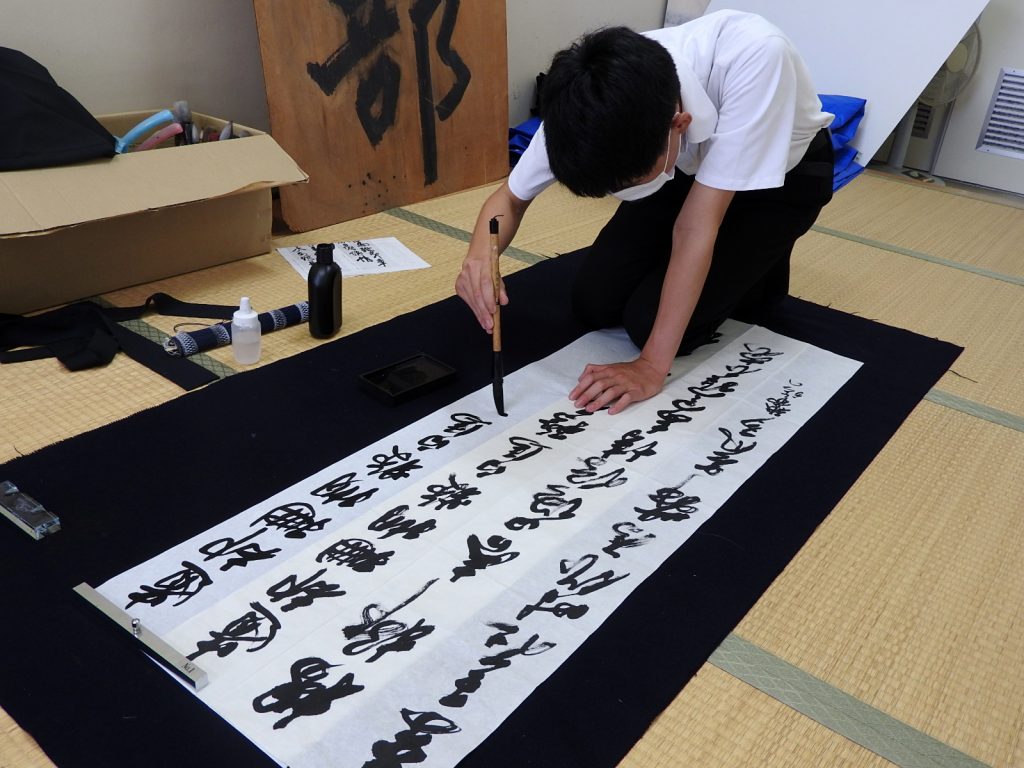 私たち書道部は普段、展覧会に向けてそれぞれの作品を練習、出品し、松柏祭では書道パフォーマンスの発表に向け、活動しています。