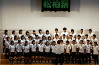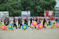 各ブロックの応援パネル 雨が心配されたので競技は短縮プログラムで行われました。 3年生各クラスによるグランド演技 午後から雨になったので、閉会式と3年フォークダンスは体育館で行いました。